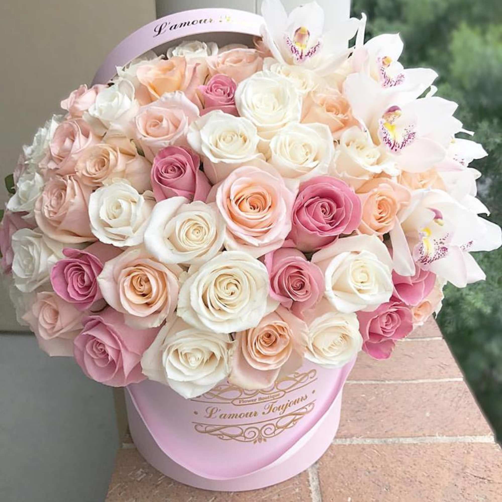 50 Premium Pink and White Roses with Cymbidium Orchid