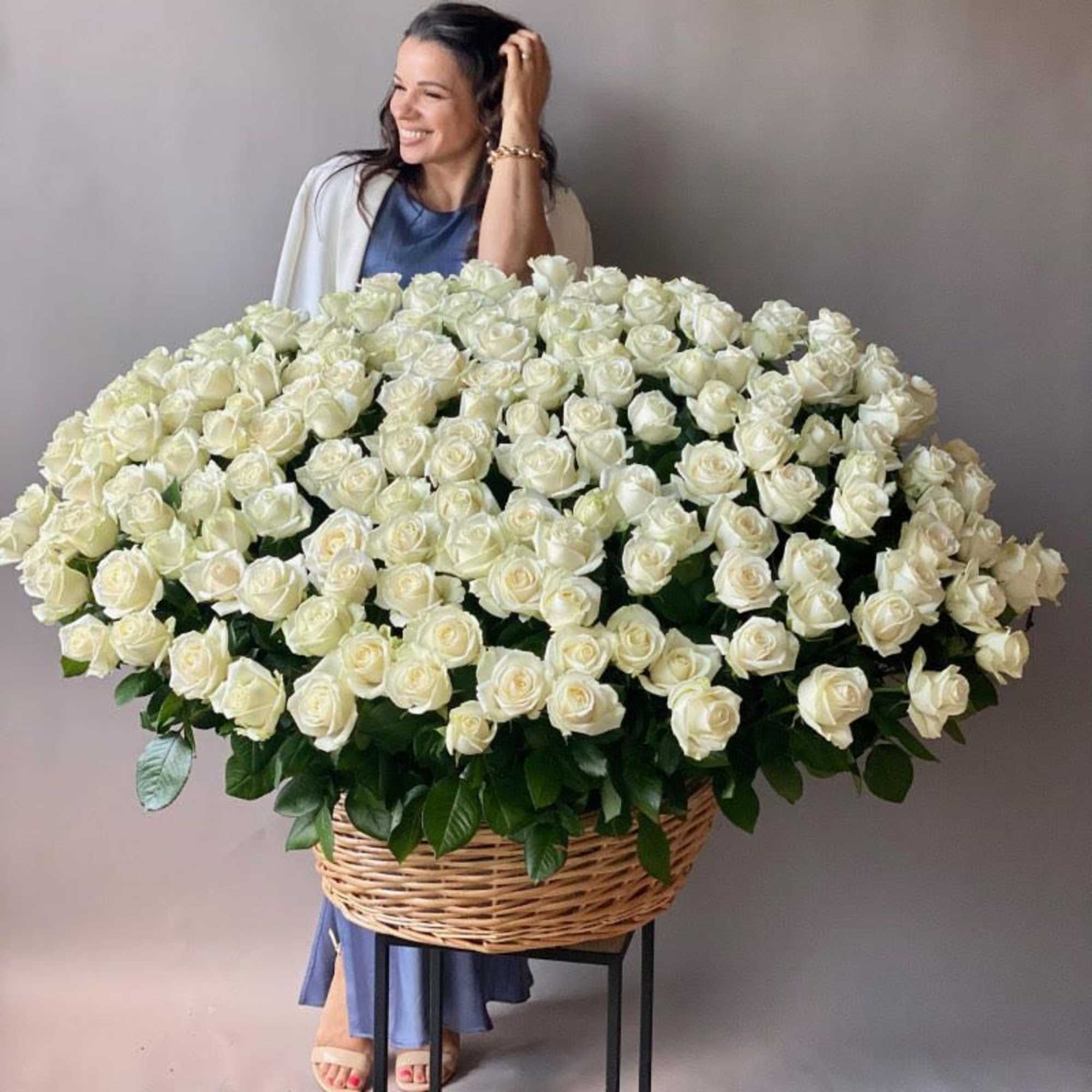 100 white roses in a basket